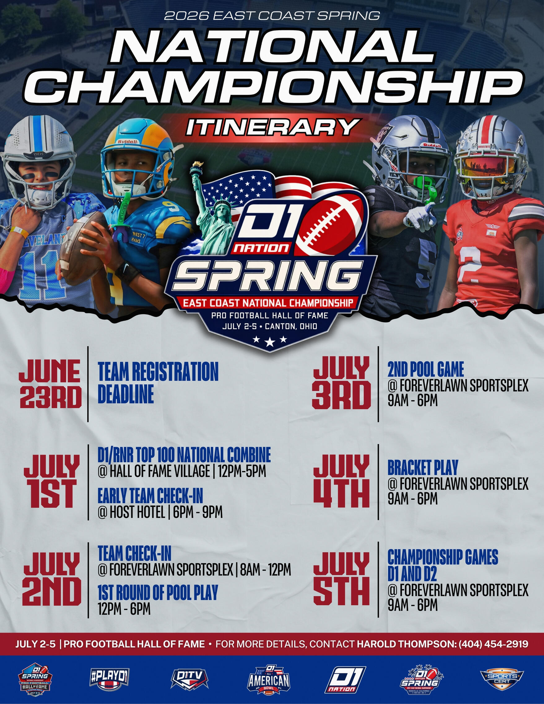 The 2026 D1 Nation East Coast Spring National Championship takes place at the Pro Football Hall of Fame in Canton, Ohio. A a modern, all-weather facility built for competition, recreation and sports tourism. The complex features ten lighted synthetic turf fields, versatile spaces for multiple sports and amenities that make every visit comfortable and memorable.